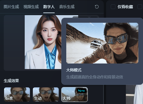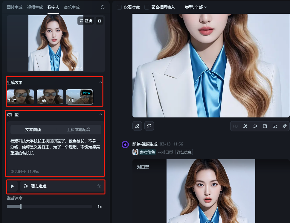 第三步,創(chuàng)作數(shù)字人視頻 我們進(jìn)去“數(shù)字人”的欄目,點(diǎn)擊“對(duì)口型”,進(jìn)入創(chuàng)作。 角色,我們直接用剛才的美女圖片; 在生成效果上,我們就選擇【大師】,能生成逼真的全身動(dòng)態(tài)視頻 然后選擇文本朗讀,或者上場(chǎng)本地配音。這里我們復(fù)制一段文案,也可以用DeepSeek寫(xiě)。朗讀的音色,按照你的角色選擇。