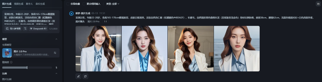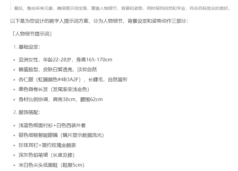 這其實(shí),就是上個(gè)月,字節(jié)發(fā)布的一項(xiàng)研究成果:OmniHuman-1大模型。 不僅能夠讓照片張嘴說(shuō)話,而且還能生成逼真的全身動(dòng)態(tài)視頻,從面部表情、身體動(dòng)作、手勢(shì)變化、物體交互等細(xì)節(jié),都非常生動(dòng)! 接下來(lái),上操作步驟 我們可以借助DeepSeek,讓他幫忙生成一個(gè)數(shù)字人形象。 提示詞:我需要用AI做一個(gè)年輕女生知識(shí)講解的數(shù)字人,請(qǐng)幫我生成人物細(xì)節(jié)的提示詞以及背景的提示詞。 DeepSeek不到30秒,就給我生成了,非常詳細(xì)的數(shù)字人提示詞: 亞洲女性,年齡22-28歲,身高165-170cm鵝蛋臉型,皮膚白皙透亮,淡妝自然杏仁眼,長(zhǎng)睫毛,自然眉形栗色微卷長(zhǎng)發(fā)(發(fā)尾漸變淺金色)身材比例協(xié)調(diào),肩寬38cm,腰圍62cm,淺藍(lán)色緞面襯衫+白色西裝外套,面對(duì)鏡頭