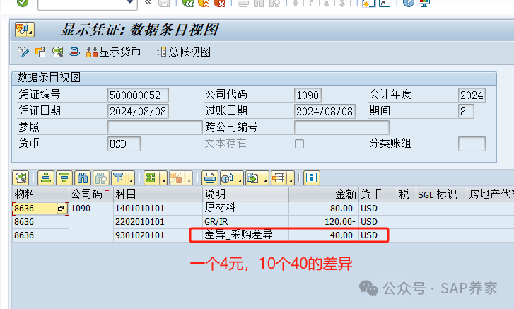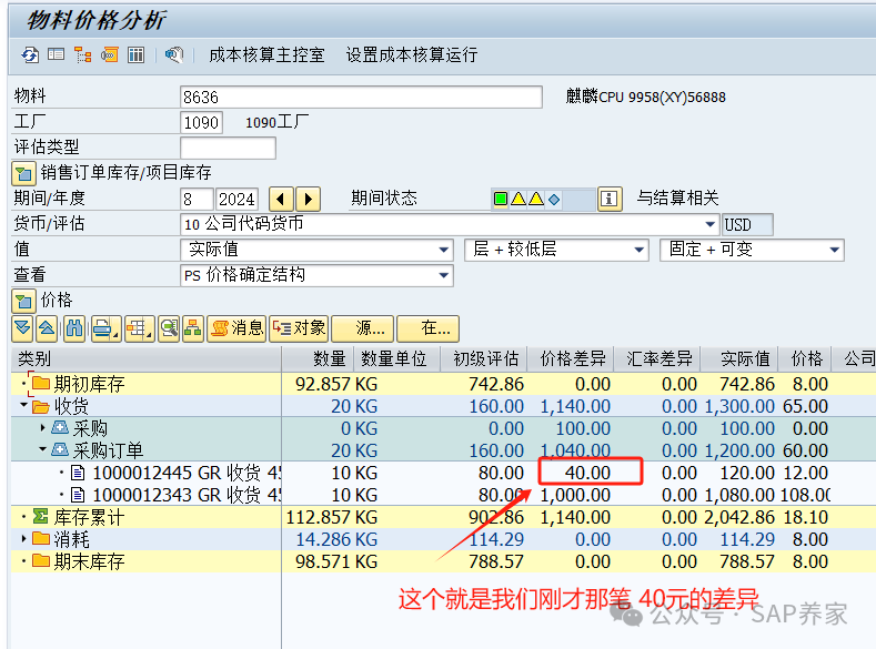 物料分類賬,很多人認為是個神秘的東西,其實講透了,也就沒那么難了。 采購入庫 10個,領(lǐng)用 3個,庫存還剩下 7個,后面會用到這個7.但消耗遠沒這么簡單。銷售出庫也是消耗。 201成本中心領(lǐng)料也是消耗。那么我們是否可以理解為庫存減少就是消耗呢?答案是NO , 202成本中心退料, 雖然是庫存增加但也是消耗。差異在消耗和庫存之間分攤規(guī)則是 按數(shù)量分。(說明:我MMRV是2024年8月,一直沒有改,大家可以忽略日期)特別注意:差異是有多筆組成,現(xiàn)在的總差異是 1140 我們回頭再看上面那張圖,消耗和期初庫存并沒有獲取到差異。大家計算下,1140 的差異是不是按14.286 和 98.571 分的。當然,144.31 沒有出現(xiàn)在,消耗那里,而是未分配那里。我沒有把這個問題隱藏,是想說明一件事。未分攤差異是項目中經(jīng)常發(fā)生的,并且沒有任何固定的解決方案。唯一的辦法就是學(xué)習(xí)并理解物料分類賬,掌握分析方法,以不變應(yīng)萬變。(見下面: 由淺入深學(xué)習(xí)物料賬)案例學(xué)習(xí)不是目的,目的是掌握方法。