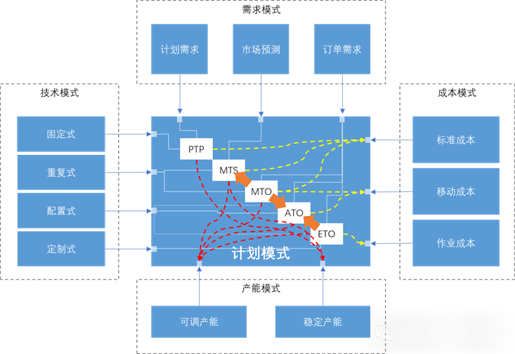 SAP的五種計劃模式比較 SAP預(yù)配置了30多種生產(chǎn)計劃模式,這些計劃模式的形成是由技術(shù)、需求、產(chǎn)能、成本、多種因素共同驅(qū)動和決定的,下面結(jié)合這四種要素針對其中的五種典型模式予以分析。 注:圖中的橙色粗箭頭表示計劃模式演進方向(詳見下文中MTO和ETO的補充說明部分)。 業(yè)務(wù)要素模式 需求要素模式: 計劃需求--來自外部因素決定的生產(chǎn)計劃(如能源生產(chǎn)計劃); 市場預(yù)測--來自基于歷史經(jīng)驗和當前經(jīng)濟狀況或預(yù)期訂單的銷售預(yù)測; 訂單需求--來自確定性的采購訂單。 技術(shù)要素模式: 固定式--生產(chǎn)工藝不受到銷售預(yù)期和訂單影響; 重復(fù)式--特定型號產(chǎn)品的生產(chǎn)工藝固定; 配置式--根據(jù)訂單要求基于成熟產(chǎn)品模塊配置組合; 定制式--根據(jù)訂單要求工程化定制。 成本要素模式: 標準成本--原材料價格采用標準計價(即便不同采購渠道的價格不一樣),非直接成本也按標準計價。 移動成本--原材料價格按照移動平均價計價。 作業(yè)成本--所有資源耗用都實時計入成本。 產(chǎn)能要素模式: 可調(diào)產(chǎn)能--根據(jù)需要可以進行資源投入調(diào)整以調(diào)節(jié)產(chǎn)能。 穩(wěn)定產(chǎn)能--產(chǎn)能一般難以調(diào)整,如能源和化工企業(yè)。 生產(chǎn)計劃模式 PTP:按計劃生產(chǎn) 典型行業(yè):流程型行業(yè),最典型的是電力行業(yè),如水電、火電、太陽能等,其次是石油化工和天然氣行業(yè)。 模式特征:生產(chǎn)計劃穩(wěn)定,生產(chǎn)技術(shù)方式固定,基于標準成本和穩(wěn)定/可變產(chǎn)能。 具體解讀: 需求:生產(chǎn)需求由整個市場行情和經(jīng)濟狀態(tài)決定,比如油汽生產(chǎn),或是受到季節(jié)性/時段性的調(diào)控影響,如電力。 技術(shù):除非有技術(shù)進步,否則特定生產(chǎn)企業(yè)的能源生產(chǎn)工藝基本固定不變。 成本:其成本雖受到宏觀經(jīng)濟狀況影響,但在此影響下采用標準成本確定售價。 產(chǎn)能:能源行業(yè)的期間性產(chǎn)能較為剛性,除非進行技術(shù)改造,但可進行計劃性技術(shù)調(diào)控(如關(guān)閉水電機組)。 補充說明:PTP作為計劃模式的命名是筆者提出(針對流程型行業(yè),命名上選擇用P【Produce】而不是M【Make】),歡迎讀者給出不同意見。 MTS:按庫存生產(chǎn) 典型行業(yè):消費品行業(yè),或工業(yè)耗材行業(yè)(如螺釘、膠帶等)。 模式特征:生產(chǎn)需求穩(wěn)定,生產(chǎn)技術(shù)方式固定,基于標準成本和可變產(chǎn)能。 具體解讀: 需求:生產(chǎn)需求來自市場預(yù)測,會有年度或季節(jié)性變化(如空調(diào))。 技術(shù):不同類型和型號規(guī)格產(chǎn)品的生產(chǎn)工藝有或大或小差異,確定產(chǎn)品型號的生產(chǎn)工藝完全重復(fù)。 成本:由于生產(chǎn)技術(shù)和產(chǎn)業(yè)體系穩(wěn)定,生產(chǎn)成本主要受到原材料價格影響,其價格變動主要受制于宏觀經(jīng)濟情況。 產(chǎn)能:產(chǎn)能可變,但基本穩(wěn)定,企業(yè)會根據(jù)市場預(yù)測進行產(chǎn)能調(diào)整,主要是在勞動密集型情況下調(diào)整雇傭工人數(shù)量,或是調(diào)整設(shè)備運行率(這部分會導(dǎo)致資源浪費,因此調(diào)整幅度很小)。 補充說明:在生產(chǎn)需求變化較大時,如果生產(chǎn)資源投入不宜變化,企業(yè)會選擇調(diào)整售價以平衡開機成本。 MTO:按訂單生產(chǎn) 典型行業(yè):高價值工業(yè)品,如生產(chǎn)設(shè)備、農(nóng)用礦用建筑機械、商用車輛。 模式特征:生產(chǎn)訂單驅(qū)動,生產(chǎn)技術(shù)方式總體固定但有變型需求,基于標準成本/作業(yè)成本和可變產(chǎn)能。 具體解讀: 需求:生產(chǎn)完全由客戶銷售業(yè)績決定,會有很大不穩(wěn)定性。 技術(shù):生產(chǎn)技術(shù)根據(jù)具體訂單要求和產(chǎn)品類型,在固定工藝技術(shù)上需要根據(jù)要求進行配型變化。 成本:根據(jù)企業(yè)的業(yè)務(wù)規(guī)模,較大生產(chǎn)規(guī)模的企業(yè)在供應(yīng)鏈完全可控的情況下可以做到標準成本,否則適宜采用移動成本,也就是會基于原材料的移動平均價確定生產(chǎn)成本。 產(chǎn)能:為適應(yīng)市場需求變化,產(chǎn)能必須可變。 補充說明:MTS模式的企業(yè)在業(yè)務(wù)發(fā)展上會朝向MTS或ATO模式演進,以大規(guī)模生產(chǎn)(MTS)或柔性生產(chǎn)(ATO)方式控制成本。 ATO:按訂單裝配 典型行業(yè):高價值工業(yè)品或消費品,最典型如PC機。 模式特征:生產(chǎn)訂單驅(qū)動,產(chǎn)品模塊化成熟,基于標準成本和可變產(chǎn)能。 具體解讀: 需求:生產(chǎn)完全由銷售業(yè)績決定,會有很大不穩(wěn)定性。 技術(shù):生產(chǎn)技術(shù)根據(jù)具體訂單要求和產(chǎn)品類型,在固定工藝技術(shù)上需要根據(jù)要求進行配型變化。 成本:ATO模式的企業(yè)因為需要積累大量預(yù)生產(chǎn)庫存,為平衡掉庫存成本更愿意采用移動平均價確定成本。 產(chǎn)能:為適應(yīng)市場需求變化,產(chǎn)能必須可變。 補充說明:如果是小型產(chǎn)品,在訂單量大且?guī)齑嬷芷诙痰那闆r下,ATO企業(yè)也可以做到標準成本模式。 ETO:按訂單定制 典型行業(yè):建造業(yè),如海工設(shè)備(海上鉆井平臺)、大型造船、大型運輸設(shè)備(如高