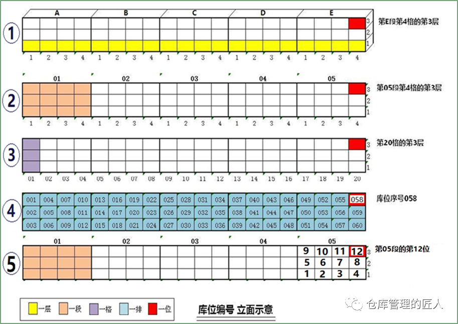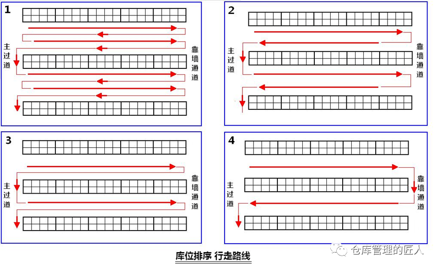 2.5 存儲(chǔ)位(以存儲(chǔ)平時(shí)配貨動(dòng)不到的貨品為主)、揀貨位(平時(shí)揀貨,配貨優(yōu)先,方便取貨的庫位) 2.6 A類庫位(取貨放貨非常方便的庫位)、B類庫位(取貨放貨方便度一般)、C類庫位(取貨放貨方便最差的庫位)我們?cè)诰S護(hù)庫位信息數(shù)據(jù)庫的時(shí)候,下面這些信息盡量維護(hù)齊全:1.地區(qū);2.樓棟;3.樓層;4.區(qū)域;5.移動(dòng)/固定;6.巷道;7.排;8.組;9.格;10.層;11.長/寬;12.高;13.進(jìn)深;14.承重;15.可用高度;16.可用容積;17.溫度區(qū)間;18.離地高度;19.離主通道距離;20.取貨便利性;21.存貨SKU限制;22.是否限定品類;23.拆分庫位數(shù);24.上級(jí)庫位;25.庫位序號(hào)/簡碼;26.庫位的中文全稱;27.上架優(yōu)先順序;28.揀貨優(yōu)先順序等。我們可以根據(jù)這些信息來判斷、分析,哪些庫位取放貨方便,哪些庫位適合存儲(chǔ)什么貨品;哪些庫位先當(dāng)先用,哪些庫位后用;哪些庫位適合什么季度使用等。我們先來看個(gè)示意圖,同樣的貨架,同樣的一個(gè)位置,但在不同的倉庫,卻有著不同的編碼規(guī)則。不同的企業(yè)倉庫庫位編碼有著不同的方法,沒有社會(huì)標(biāo)準(zhǔn),也沒有行業(yè)標(biāo)準(zhǔn),大家都認(rèn)為適合自己的就好。事實(shí)上大企業(yè)與小企業(yè),大倉庫與小倉庫,幾十個(gè)倉庫與只有一個(gè)倉庫,庫位編碼的規(guī)則確實(shí)是不一樣的。有的時(shí)候我們的庫位編碼,需要體現(xiàn):地區(qū)碼、倉庫碼、區(qū)域碼、排號(hào)(或巷道號(hào))、組號(hào)、格號(hào)、層號(hào),但有的時(shí)候不需要。比如說有些倉庫較小,整個(gè)倉庫也就500個(gè)庫位左右,那我們就可以直接用A001到A500就可以,不需要在庫位編碼上體現(xiàn)什么區(qū)域,什么排,什么格,哪一層,只需要在庫位基礎(chǔ)信息數(shù)據(jù)庫中體現(xiàn)。這里的“A”可以是倉庫的代碼,也可以是區(qū)域的代碼。如果倉庫較多,庫區(qū)面積較大,且?guī)煳惠^多,庫位又分為不同的庫區(qū)和類型,達(dá)到數(shù)萬,那么我們就要體現(xiàn)區(qū)域和排號(hào),以及組號(hào),層號(hào)。無論編碼是什么規(guī)則,總而言之,字段上最好不要超過10位數(shù),中間的杠最好不要超過3個(gè)。對(duì)于全國性的倉庫編碼,庫位編碼中間的杠也盡量不要超過4個(gè),且?guī)煳粯?biāo)識(shí)上該放大的信息要放大。現(xiàn)實(shí)中,我們最怕的就是教條化,不能靈活變通。無論什么倉庫,我們?cè)谧鰩煳痪幋a的時(shí)候,盡量考慮以下幾點(diǎn):A).力求字段數(shù)最少,只要能表達(dá)意義,能簡則簡;B).要考慮員工的行走路徑和識(shí)別習(xí)慣;比如說:員工面對(duì)一組貨架的時(shí)候,左邊是小號(hào),右邊是大號(hào),下面是小號(hào),上面是大號(hào),那么整個(gè)公司所有倉庫,都盡量是這個(gè)原則,因?yàn)閱T工時(shí)間長了會(huì)形成習(xí)慣,如果庫位排序規(guī)則不一樣就會(huì)影響判斷,甚至出錯(cuò)。也就是說,如果增加或減少(貨架)庫位,那么新增的庫位編碼會(huì)不會(huì)帶來什么影響。如果因?yàn)榈截浟吭黾踊驕p少,現(xiàn)有庫位需要組合成大庫位,要拆分成小庫位,好不好辦。D).員工不需要看的信息,意義不大的信息盡量不要體現(xiàn)在庫位編碼字段上。我們?cè)趲煳痪幋a和庫位標(biāo)簽打印的時(shí)候,要盡量避免類似下面這兩種情況:上圖中第1種情況存在問題是庫位編碼顯得復(fù)雜,字段較多,同時(shí)在打印的時(shí)候不顯目,條碼也小,不方便掃描;上圖中第2種情況是庫位編碼字段當(dāng)中沒有用杠“—”區(qū)分,字?jǐn)?shù)多,容易讓人看花眼,好在打印標(biāo)識(shí)的時(shí)候,在左邊加上了中文注明。5)庫位編碼對(duì)揀貨路徑和揀貨距離的影響:由于我們平時(shí)在倉庫中配貨是根據(jù)庫位的排序進(jìn)行揀貨,那不同的庫位編碼規(guī)則就會(huì)有不同的庫位排序。如果編庫位的時(shí)候,是以排為單位,大多會(huì)出現(xiàn)下面的路線1;以巷道為單位,“左單右雙”編庫位,大多會(huì)出下面的路線2;有的倉庫同一巷道是按U字形順序編排庫位,就會(huì)形成下面的路線3??偟膩碚f,第2種路線相對(duì)會(huì)好一些。但需要注意的是,電商倉庫與非電商倉庫(如傳統(tǒng)制造業(yè)、2B倉庫)在編排庫位時(shí)要求并不一樣。雖然庫位排序路徑可能最短,但實(shí)際上個(gè)別庫位揀貨與大多庫位揀貨產(chǎn)生的路徑是不一樣的。可能看完上圖,很多人都會(huì)認(rèn)為第4種路線編排庫位是最好的,但并不是,為什么呢?如果不是每個(gè)庫位都需要揀貨,那么人員在揀貨時(shí),走的路徑就比較靈活。如下圖:因?yàn)槿绻枰獟浀闹挥屑t色標(biāo)注的這2個(gè)庫位,請(qǐng)問我們還需要按箭頭顯示的路線行走嗎?肯定不需要。所以只有在一個(gè)巷道大多庫位需要揀貨時(shí),我們這樣的設(shè)計(jì)才是最好的,否則就不一定好。當(dāng)然,第1種路線肯定不好,但實(shí)際上很多企業(yè)只要是以排為單位編庫位就是第1種行走路線。總的來說,庫位設(shè)計(jì),按第3種路線是相對(duì)較好的一種!如果我們一組貨架或一個(gè)庫位,只存儲(chǔ)一種貨品,我們可以稱這組貨架或這個(gè)庫位為“A001”,但如果這組貨架或這個(gè)庫位放了多種貨品,那我們就可以將這組貨架各個(gè)貨品的庫位取名為:A001-1,A001-2,A0