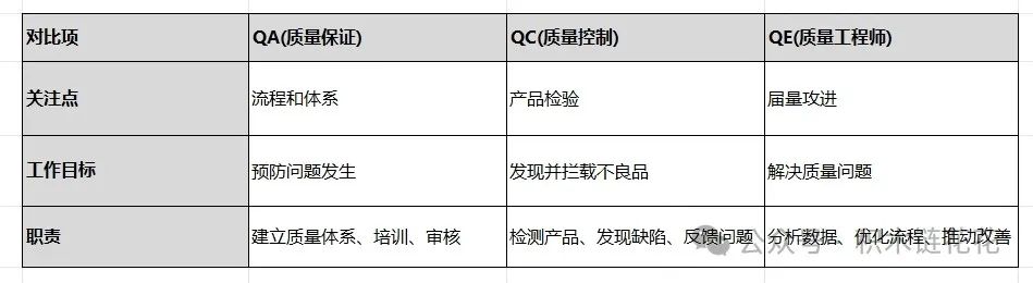 不僅是手機,任何產(chǎn)品如果質量出現(xiàn)問題,都會影響到消費者的信任,甚至會直接導致企業(yè)的衰退。例如,在食品行業(yè),如果質量出現(xiàn)問題,可能會導致食品安全事故,企業(yè)面臨的后果不僅僅是賠償,更可能是永久失去顧客,甚至面臨法律訴訟和行業(yè)處罰。 所以,質量管理是每個企業(yè)生存和發(fā)展的基礎,確保產(chǎn)品的質量好,才能贏得顧客的信賴和忠誠。 質量管理是啥? 質量管理就是企業(yè)為了確保產(chǎn)品符合標準,滿足顧客的需求,從而達到客戶滿意度并保障企業(yè)可持續(xù)發(fā)展的管理活動。簡單來說,質量管理就是“確保產(chǎn)品好用、耐用,顧客滿意”。而這背后的體系、工具和手段,正是QA、QC和QE三大角色和方法。 質量管理的“大目標” 質量管理的最終目標是確保產(chǎn)品符合相關標準,滿足顧客的需求,使企業(yè)能夠在市場中持續(xù)盈利。這不僅僅是通過一次次的檢查和控制,而是通過一整套系統(tǒng)化、精細化的管理和改進,持續(xù)提高產(chǎn)品的質量。 質量管理的“小任務” 為了實現(xiàn)這個大目標,質量管理包含了許多小任務。這些任務包括: 檢查產(chǎn)品是否符合標準。每一個環(huán)節(jié)的產(chǎn)品都需要通過檢查,確保它們符合設計和生產(chǎn)標準。 防止次品流到顧客手中。這意味著企業(yè)需要在生產(chǎn)的各個階段做出有效的控制,避免質量問題的發(fā)生。 不斷改進產(chǎn)品。通過質量數(shù)據(jù)的分析和反饋,企業(yè)可以了解產(chǎn)品的不足之處,及時進行改進,以提升產(chǎn)品的品質。 QA、QC、QE:質量管理的“三兄弟” 在質量管理的過程中,QA(質量保證)、QC(質量控制)和QE(質量工程)是三個核心角色。它們的工作內(nèi)容不同,但又密切配合,共同確保產(chǎn)品質量。 QA(質量保證):提前規(guī)劃,預防問題定義:QA就是“提前想好,別出問題”。它的核心是“預防”而非“糾正”。 工作內(nèi)容: 制定規(guī)則:就像學校有校規(guī)一樣,企業(yè)也要有質量管理規(guī)范。QA負責制定這些規(guī)則,確保每個生產(chǎn)環(huán)節(jié)都能嚴格遵守。 檢查規(guī)則的執(zhí)行:QA不僅要制定規(guī)則,還要確保每個環(huán)節(jié)都按照標準流程進行,避免質量問題的發(fā)生。 培訓員工:QA還需要對員工進行培訓,幫助他們理解和掌握如何確保質量的措施和方法。 QC(質量控制):生產(chǎn)過程中的“質檢員”定義:QC就是“邊做邊檢查,發(fā)現(xiàn)問題馬上解決”。 工作內(nèi)容: 檢查原材料:QC首先要確保原材料符合質量要求,沒有任何缺陷。 檢查生產(chǎn)過程:生產(chǎn)過程中,QC會實時監(jiān)控每個環(huán)節(jié),發(fā)現(xiàn)問題及時進行修正,確保產(chǎn)品的質量不會受到影響。 檢查成品:生產(chǎn)完成后的產(chǎn)品,QC會對其進行嚴格檢查,確保它符合最終的質量標準。 QE(質量工程):發(fā)現(xiàn)問題,改進產(chǎn)品定義:QE就是“發(fā)現(xiàn)問題,想辦法解決,讓產(chǎn)品更好”。 工作內(nèi)容: 分析問題:如果出現(xiàn)了質量問題,QE會深入分析,查明問題的根源。 改進工藝:當發(fā)現(xiàn)某個生產(chǎn)環(huán)節(jié)的工藝存在問題時,QE會提出改進方案,優(yōu)化生產(chǎn)過程,提高產(chǎn)品質量。 提升產(chǎn)品:QE還會持續(xù)對產(chǎn)品進行改進,提升其性能、耐用性以及用戶體驗。 QA、QC、QE的區(qū)別:就像做飯的三個步驟