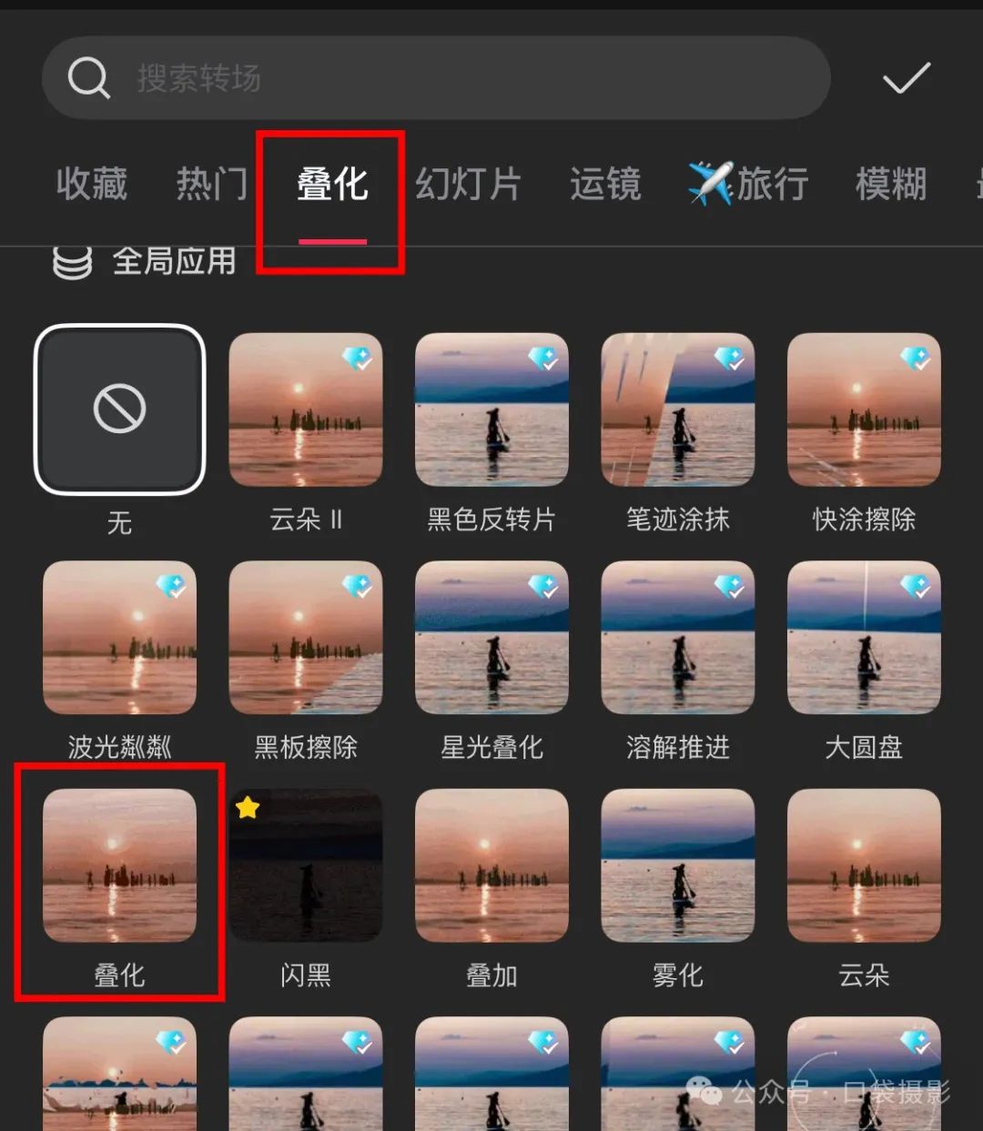 2. 點擊它,進入轉(zhuǎn)場界面,選擇你喜歡的分類和具體特效(如:【疊化】分類中的【疊化】)。