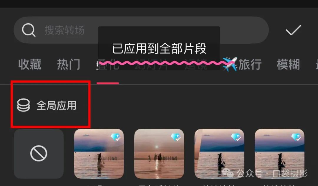 4. 若想全片統(tǒng)一風格,可點擊左上角【全局應用】,為所有鏡頭統(tǒng)一添加相同的轉(zhuǎn)場特效。