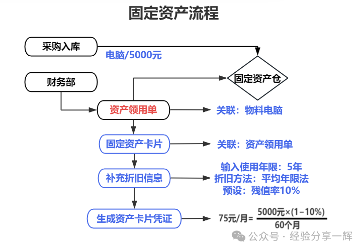 流程1:使用部門新增(資產(chǎn)領(lǐng)用單)——去倉(cāng)庫(kù)領(lǐng)貨(關(guān)聯(lián)采購(gòu)單)——(資產(chǎn)領(lǐng)用單轉(zhuǎn)固定資產(chǎn)卡片)——(補(bǔ)充折舊信息)預(yù)計(jì)使用年限和折舊方法——生成(資產(chǎn)卡片憑證)。 流程2:新增(固定資產(chǎn)卡片)——關(guān)聯(lián)(資產(chǎn)領(lǐng)用單)——(補(bǔ)充折舊信息)預(yù)計(jì)使用年限和折舊方法——生成(資產(chǎn)卡片憑證)。 固定資產(chǎn)卡片:按折舊方法(折舊)——如有調(diào)動(dòng)(固定資產(chǎn)變動(dòng)處理)——報(bào)廢(清理)——(期末結(jié)賬)。 舉個(gè)例子:買了一臺(tái)5000元的電腦,財(cái)務(wù)部使用,使用年限為5年,殘值率10%,折舊方法(平均年限法),每月折舊75元;