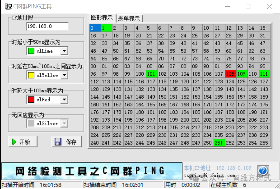 2、C網(wǎng)群Ping工具這款小工具對于做網(wǎng)絡(luò)、弱電類的,非常有作用,小巧且實用,菜單也非常簡單,很方便輸入目標(biāo)地址段顏色選擇,點擊開始就可以掃描。輸入IP地址段,然后點開始即可,如圖: