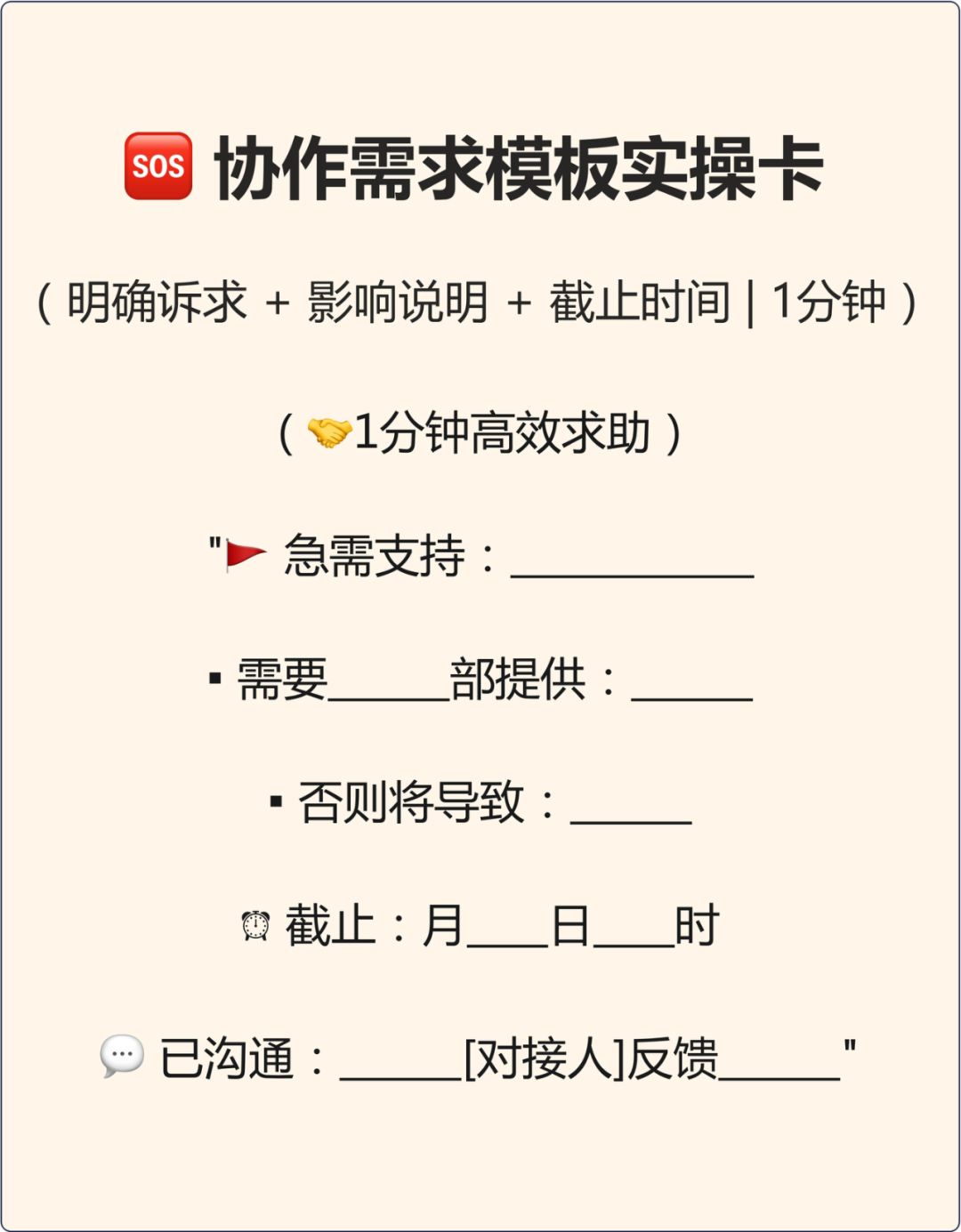1. 你可以通過公式直接來發(fā)言 明確訴求:“需財(cái)務(wù)部提供采購合同模板(避免重復(fù)談判,節(jié)省2天時(shí)間)。” 影響說明:“若本周五前未提供,采購流程將延遲,導(dǎo)致設(shè)備到貨晚3天,影響測試進(jìn)度?!?/span> 截止時(shí)間:“請財(cái)務(wù)部于周三12:00前反饋,我方同步準(zhǔn)備審批材料?!?/span> 2. 為什么這么講? ?“如果其他部門不配合,我該怎么推動(dòng)?” ?答案:用“后果倒逼法”! 公式拆解: 明確訴求:直接說“要什么”(比如“合同模板”比“需要支持”更具體)。 影響說明:說清楚“不配合的后果”(比如“設(shè)備晚到3天”比“可能延期”更有壓力)。 截止時(shí)間:設(shè)定明確期限,避免“盡快”這種模糊詞。 ?“如果你是領(lǐng)導(dǎo),你希望下屬怎么提需求?” ?答案:希望他“訴求清晰、后果明確、時(shí)間緊迫”,讓我能快速?zèng)Q策。