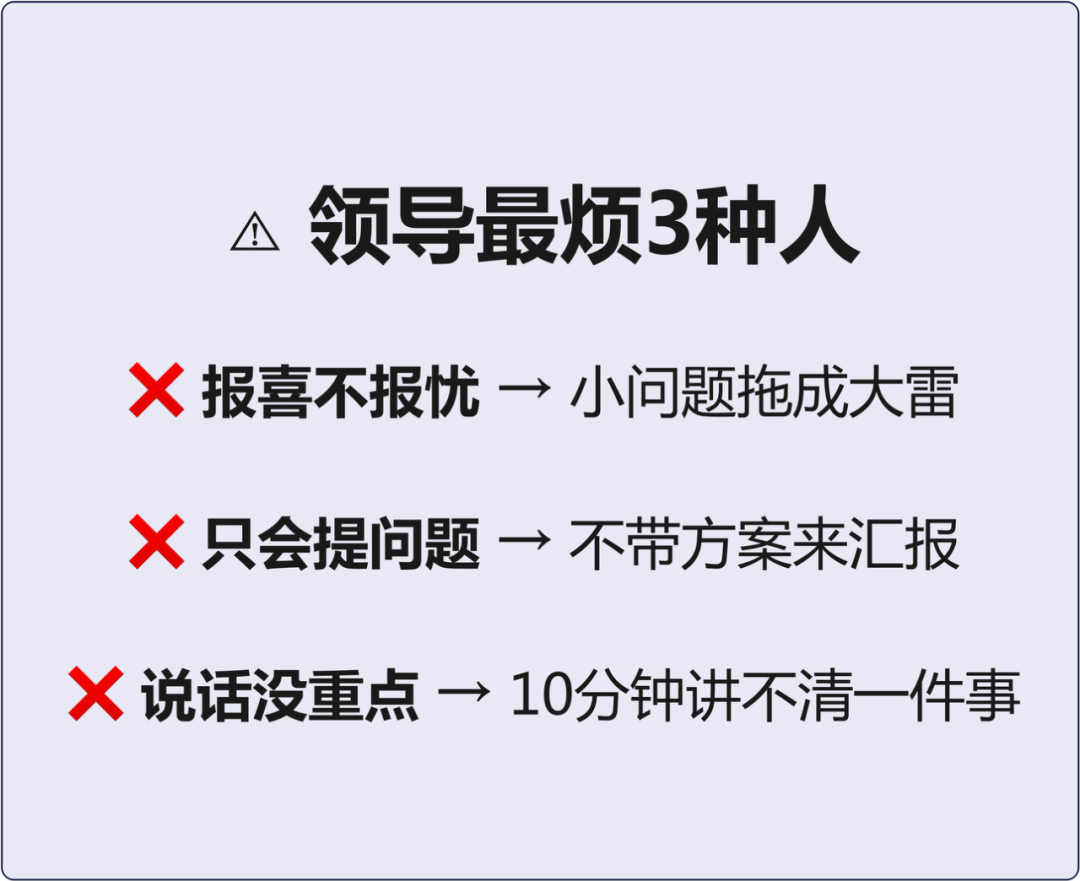 1. 你可以直接背模板。 總結(jié):“上周成果有亮點(diǎn)(比如客戶投訴減少),但風(fēng)險(xiǎn)需警惕(比如測試滯后);本周聚焦補(bǔ)測、投訴處理、預(yù)算調(diào)整。” 下一步:“計(jì)劃已分解到責(zé)任人,周三前提交風(fēng)險(xiǎn)預(yù)案,周五前完成客戶確認(rèn)?!?/span> 開放提問:“以上匯報(bào)是否清晰?是否有需要補(bǔ)充或調(diào)整的地方?”(保持微笑,眼神交流) 2. 為什么這么講? ?“如果領(lǐng)導(dǎo)中途打斷我,我該怎么辦?” ?答案:先記下問題,后補(bǔ)回答! 公式拆解: 總結(jié):用“成果+風(fēng)險(xiǎn)”收尾,避免“報(bào)喜不報(bào)憂”。 下一步:說清楚“誰做、做什么、什么時(shí)候完成”,讓領(lǐng)導(dǎo)放心。 開放提問:留出互動(dòng)空間,體現(xiàn)你的開放態(tài)度。 ?“如果你是領(lǐng)導(dǎo),你希望下屬怎么結(jié)尾?” ?答案:希望他“邏輯完整、態(tài)度謙遜、留有余地”,而不是“說完就走”。 領(lǐng)導(dǎo)喜歡的原因就是,邏輯完整、態(tài)度開放、留有余地,體現(xiàn)管理者“成熟穩(wěn)重”。 若領(lǐng)導(dǎo)提問,可先重復(fù)問題再回答(如:“您問的是驗(yàn)收風(fēng)險(xiǎn)預(yù)案嗎?我們計(jì)劃……”),確保溝通無偏差。 案例實(shí)操:5分鐘匯報(bào),讓領(lǐng)導(dǎo)對你刮目相看!