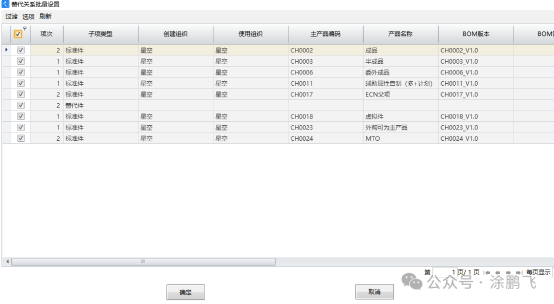 然后在“替代關(guān)系批量設(shè)置”界面中,勾選需要批量設(shè)置的BOM,再點(diǎn)【確定】即可,如下圖所示: