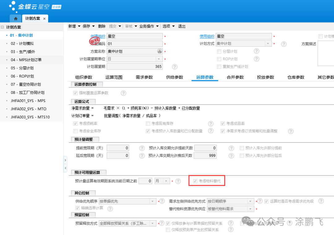 計劃方案的【運(yùn)算參數(shù)】頁簽需勾選“考慮物料替代”