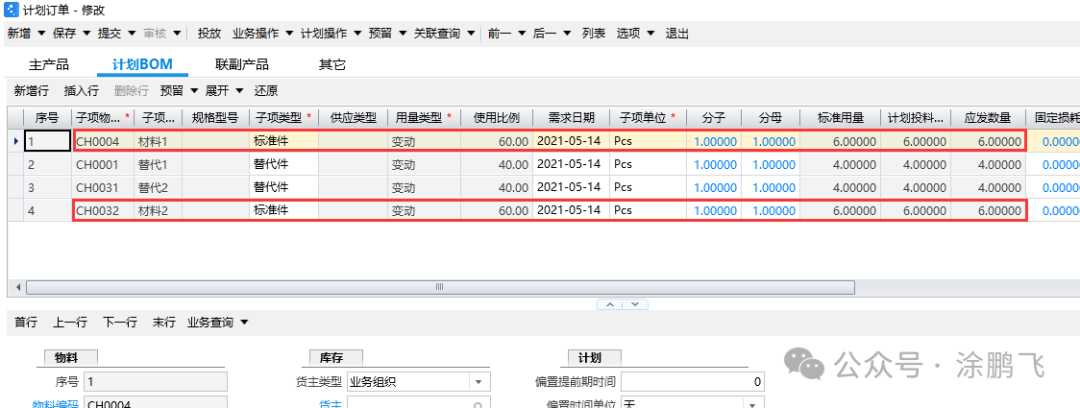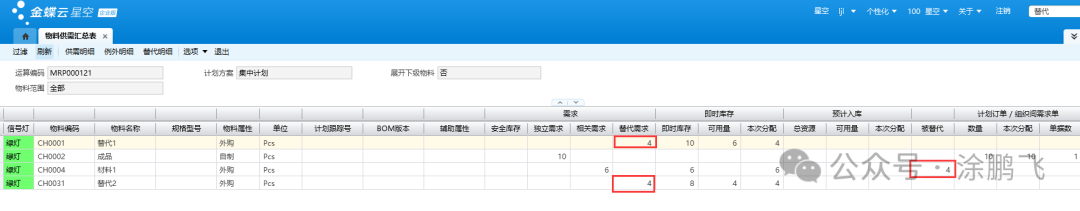 MRP運(yùn)算后,分析計算結(jié)果。 根據(jù)本案例,需求10pcs,替代策略為混用替代,作為替代主料的材料1庫存有6pcs,因此剩余4pcs的需求要產(chǎn)生替代,作為替代主料的替代1庫存有10pcs,可以滿足4pcs的需求,所以最終主物料需求6pcs,替代料需求4pcs,由于材料2庫存為0pcs,因此需要跑出6pcs的計劃訂單進(jìn)行供應(yīng)。運(yùn)算后成品的計劃BOM如下圖所示,其中材料1和材料2的需求是6pcs,替代1和替代2的需求是4pcs。