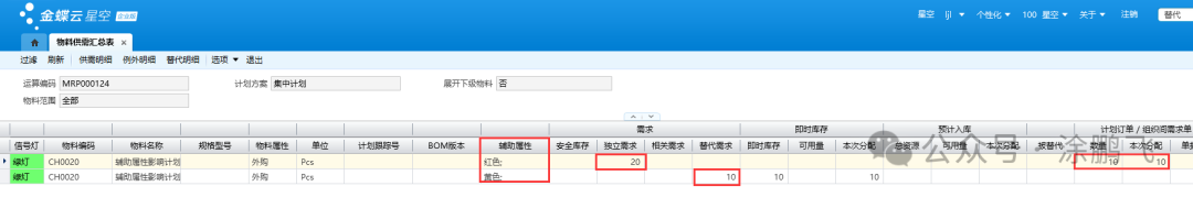 新增銷售訂單,輔助屬性選擇紅色,需求數(shù)量20pcs,在計劃方案的運(yùn)算參數(shù)頁簽勾選“考慮物料替代”,輔助屬性是紅色的即時庫存為0,輔助屬性是黃色的即時庫存有10pcs。進(jìn)行計劃運(yùn)算之后,只需再投放10pcs輔助屬性是紅色的計劃訂單即可。如下圖所示。