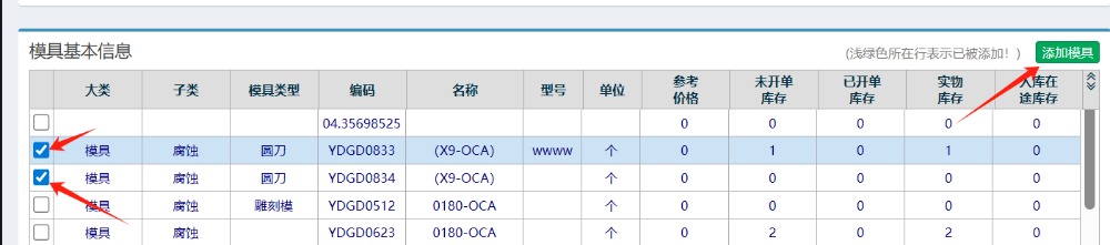 勾選上要解除的模具號,然后點(diǎn)擊添加 如下圖: