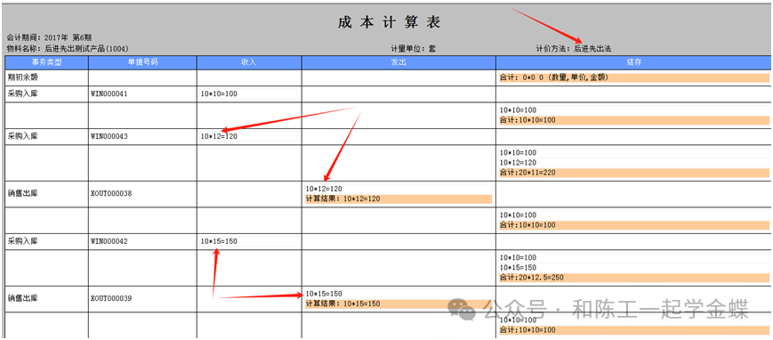 4.后進(jìn)先出法 4.1 計(jì)算方式:出庫成本單價(jià)=按單據(jù)日期的最后入庫的先發(fā)出, 4.2 計(jì)算結(jié)果:5號(hào)的出庫成本取2號(hào)的入庫成本12塊 15號(hào)的出庫成本取10號(hào)的入庫成本15塊