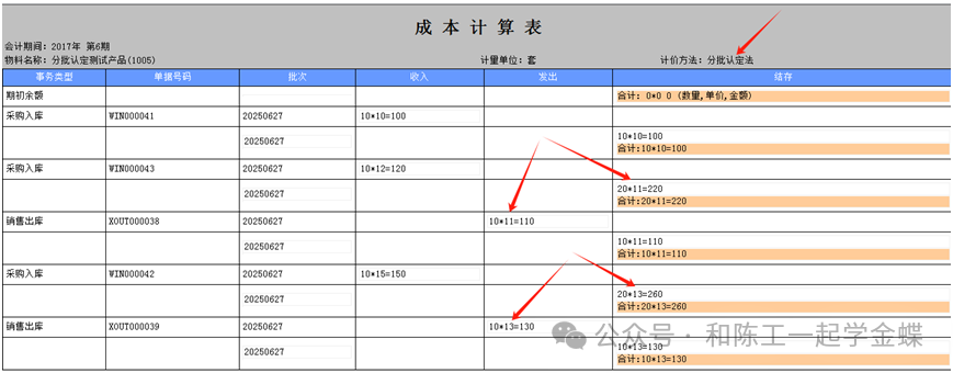 5.分批認(rèn)定法: 5.1計(jì)算公式:出庫成本單價(jià)=同一批次(期初金額+本次出庫前收入金額)/(期初數(shù)量+本次出庫前收入數(shù)量) 5.2 計(jì)算結(jié)果:6.5號(hào)的出庫取1號(hào)2號(hào)的加權(quán)平均成本11塊,6.15號(hào)的出庫取10號(hào)的結(jié)存金額和10號(hào)的加權(quán)平均單價(jià)13塊