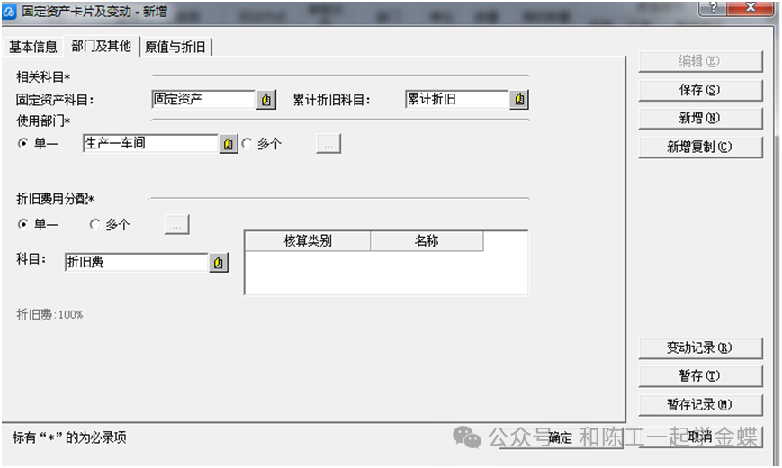 第二個界面:固定資產(chǎn)及累計折舊和折舊費用各對應(yīng)財務(wù)會計科目,以及使用部門