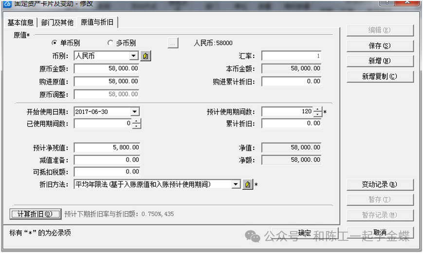 第三個界面是最重要的:購買原值,開始使用日期,預(yù)計使用月份,及對應(yīng)的折舊方法,點右上角的保存后,再點計算折舊,就會算出以后每個月會折舊多少金額,最后點下面的確定,一張卡片就錄完了。