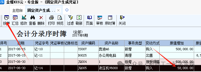 二. 憑證生成 進(jìn)入主界面,點固定資產(chǎn)生成憑證,就會過濾出當(dāng)月新增的卡片,選擇要生成憑證的卡片,左上角可以按單(一張卡片生成一張憑證),也可以匯總(多張卡片生成一張匯總憑證),然后會彈出憑證,借方默認(rèn)是固定資產(chǎn),貸方科目是現(xiàn)金銀行還是應(yīng)付賬款,手工補(bǔ)上再點保存憑證。