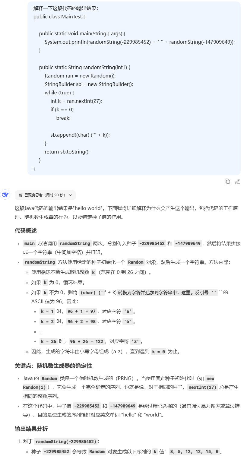 最輝煌的時(shí)候,是 2020 年。 可能那個(gè)時(shí)候大家都在居家辦公,遇到問(wèn)題也沒(méi)有同事可以咨詢,就順手在網(wǎng)上求助網(wǎng)友了。 但急轉(zhuǎn)直下也是在 2020 年。 因?yàn)槟且荒昴?ChatGPT 橫空出世,并憑借還算不錯(cuò)的表現(xiàn),慢慢被大家開(kāi)始接受了。 而這幾年 AI 發(fā)展的突飛猛進(jìn),越來(lái)越少的人選擇 stack overflow。 至于為啥越來(lái)越少的人選擇 Stack Overflow? 我想還是在于便捷性上。 和 AI 交互,你給它問(wèn)題,它能立馬響應(yīng),直接給你正確答案,或者引導(dǎo)你去尋找正確答案。 和 Stack Overflow,或者和任何問(wèn)答平臺(tái)交互,你發(fā)布問(wèn)題之后得等,等到有人看到你的問(wèn)題,然后才有可能會(huì)回答。 如果你只是想在 Stack Overflow 里面找一個(gè)問(wèn)題的答案,而不是打算自己提出一個(gè)問(wèn)題的話,那 AI 更加是碾壓式的存在。 因?yàn)槟憧梢宰?AI 幫你在 Stack Overflow 里面找答案。 Stack Overflow 免費(fèi)提供了它十幾年間的所有問(wèn)答數(shù)據(jù),然后被各個(gè) AI 當(dāng)做了訓(xùn)練模型。 最后落得的下場(chǎng),說(shuō)好聽(tīng)點(diǎn)叫功成身退,說(shuō)難聽(tīng)點(diǎn)就是卸磨殺驢。 我記得曾經(jīng)還有一個(gè)關(guān)于程序員的梗。 就是當(dāng)程序捕獲到異常之后,由程序自動(dòng)發(fā)起一個(gè)請(qǐng)求給 Stack Overflow,然后獲取解決方案。 所以,作為程序員,你應(yīng)該知道 Stack Overflow 在某種程度上,它就是程序員的圣經(jīng),它的回答就是權(quán)威。 我寫技術(shù)類文章的時(shí)候,如果順著問(wèn)題找到一個(gè) Stack Overflow 的鏈接,我在潛意識(shí)里面就會(huì)認(rèn)為,這個(gè)鏈接里面就會(huì)有我在尋找的答案,而且是正確答案。 但是這些都是很新鮮的“過(guò)去的故事”了。 我把前面獲取到的表格排序后拉到表格最后,2025 年的數(shù)據(jù)已經(jīng)跌落到了 2008 年的水平: ![]() 再回頭看看這個(gè)走勢(shì)圖: ![]() 不得不承認(rèn),Stack Overflow,幾乎是成不可逆轉(zhuǎn)之勢(shì)般的倒下了。 兩個(gè)問(wèn)題。我之前寫過(guò)的技術(shù)文章中,Stack Overflow 出現(xiàn)的頻率非常的高。 有時(shí)候我會(huì)去上面找素材。 以至于一提到 Stack Overflow 我立馬就能想起至少兩個(gè)我寫過(guò)的有意思的問(wèn)題。 第一個(gè)問(wèn)題是這樣的: 《我被這個(gè)瀏覽了 746000 次的問(wèn)題驚住了!》 ![]() 當(dāng)時(shí)覺(jué)得這個(gè)輸出結(jié)果很奇怪,有點(diǎn)意思,于是研究了一下。 最終經(jīng)過(guò)一番折騰也是在 Stack Overflow 找到了答案。 但是現(xiàn)在,我只需要把問(wèn)題扔給各種 AI 大模型,比如 DeepSeek。 它就能給出答案: ![]() 然后還可以繼續(xù)追問(wèn)“額外5分43秒”產(chǎn)生的具體原因是什么: ![]() 給出的參考鏈接中也有 Stack Overflow 的鏈接: ![]() 第二個(gè)問(wèn)題是這樣的: ![]() 把這個(gè)問(wèn)題扔給 DeepSeek 之后,它也很快就給出了答案: ![]() 答案總結(jié)起來(lái)就是一句話: 偽隨機(jī)數(shù)生成器的序列是確定的,但看起來(lái)“隨機(jī)”。 這些特定的種子值(-229985452 和 -147909649)是通過(guò)反向計(jì)算或暴力搜索找到的,目的是使 nextInt(27) 的序列恰好匹配 "hello" 和 "world" 的字符編碼。 好,現(xiàn)在如果沒(méi)有 AI,我給你上面這兩段代碼。 甚至我直接告訴你,這個(gè)代碼的輸出結(jié)果可能是 1900-01-01 08:05:43: