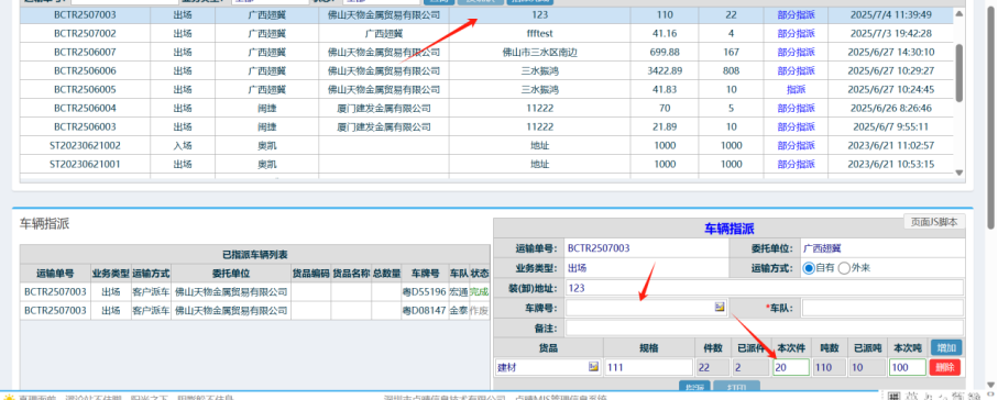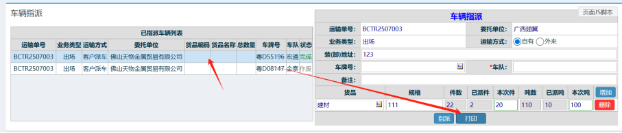 2.進(jìn)入界面后,選擇對(duì)應(yīng)的運(yùn)輸單,指派對(duì)應(yīng)車牌號(hào),錄入派車的件數(shù),點(diǎn)擊指派按鈕 如下圖所示: