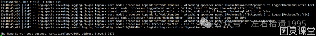 3.5.2 啟動(dòng)NameServerNameServer的配置修改完成,然后我們用靜默啟動(dòng)的方式啟動(dòng)NameServer服務(wù),啟動(dòng)完成后在nohup.out里看到這一條關(guān)鍵日志就是啟動(dòng)成功。并且使用jps指令可以看到有一個(gè)NamesrvStartup進(jìn)程。