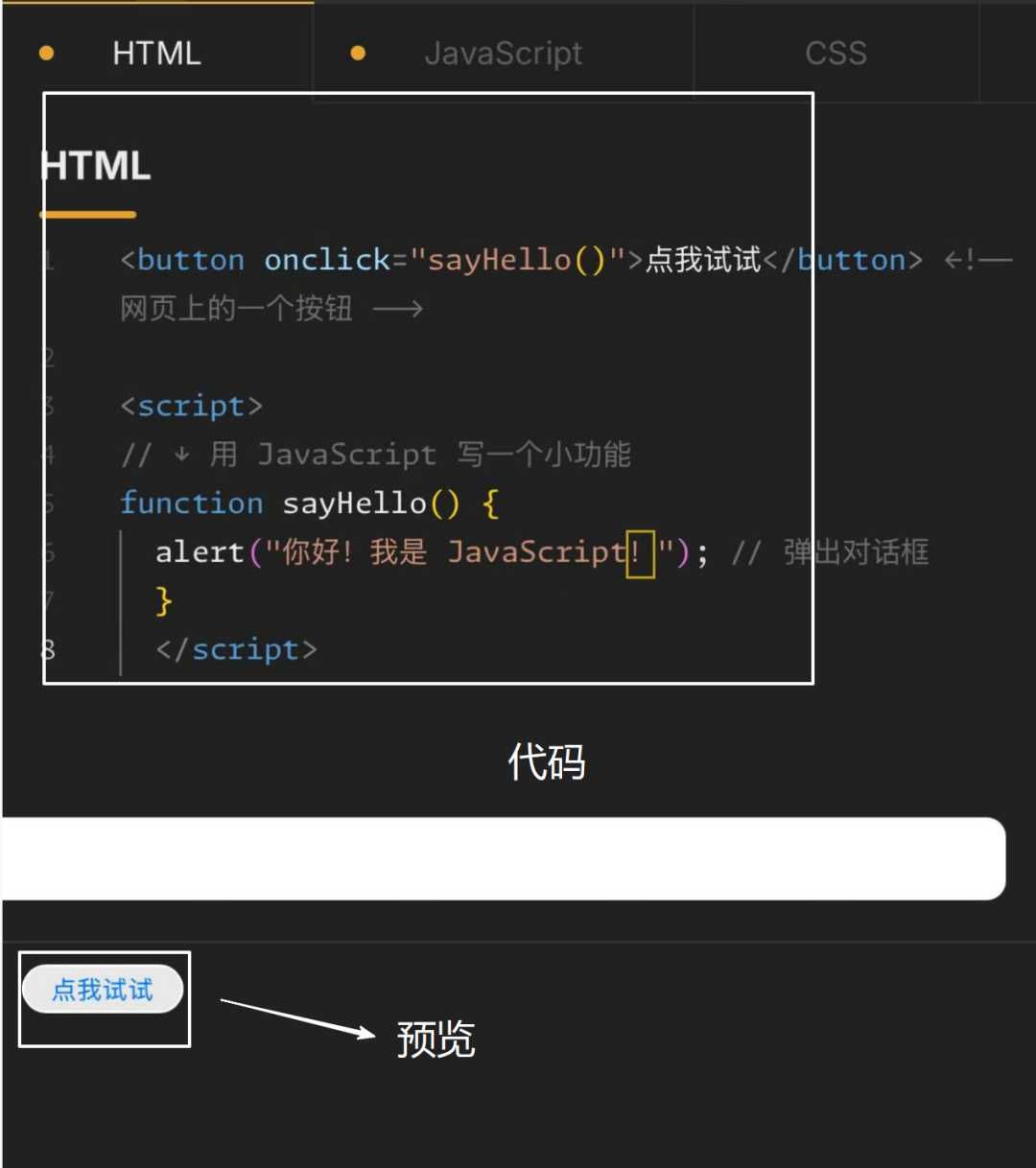 ?? 核心:動(dòng)態(tài)交互! 讓靜態(tài)的網(wǎng)頁能響應(yīng)用戶的操作。 ![]() ?? 3. 代碼長啥樣? (簡單示例) 看看這段最基礎(chǔ)的 JS 代碼做了什么: