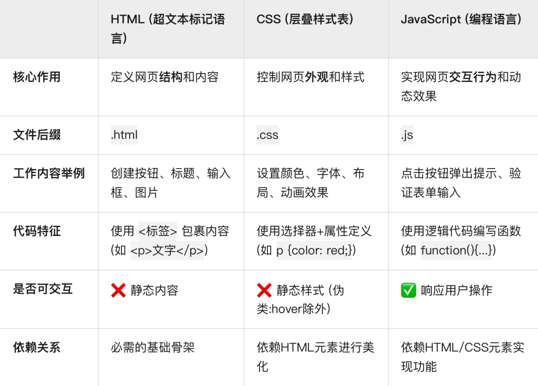 我們上篇解釋了JavaScript是什么。本篇將講解它與HTML、CSS的區(qū)別以及三者如何協作。 學習到這里,我相信你已經多少意識到這三種技術存在關聯性,但需要更系統的解釋。 這是個極其重要的基礎問題,HTML、CSS、JavaScript 就像建造一棟房子的三大核心工種,它們各司其職又緊密配合: 三者關系: 詳細區(qū)別對照表 三者如何聯動?(簡易代碼演示)