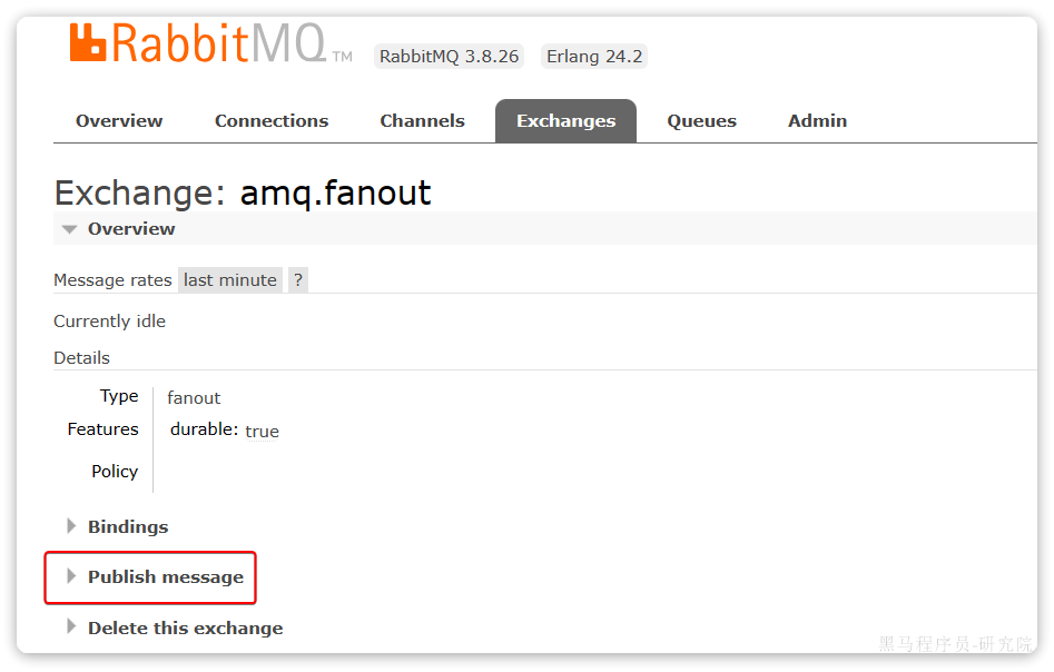 這里是由控制臺模擬了生產(chǎn)者發(fā)送的消息。由于沒有消費(fèi)者存在,最終消息丟失了,這樣說明交換機(jī)沒有存儲消息的能力。