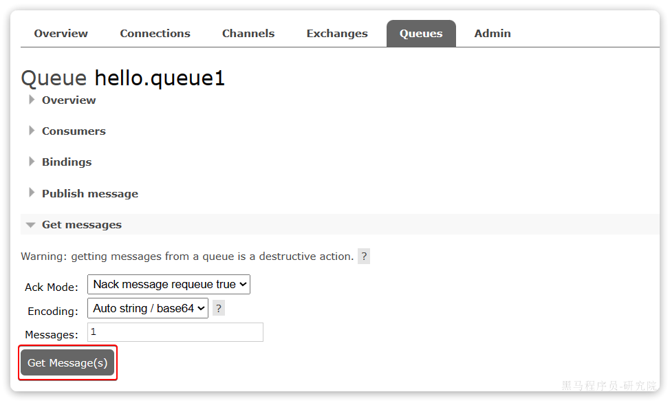 點(diǎn)擊隊(duì)列名稱,進(jìn)入詳情頁,查看隊(duì)列詳情,這次我們點(diǎn)擊get message:
