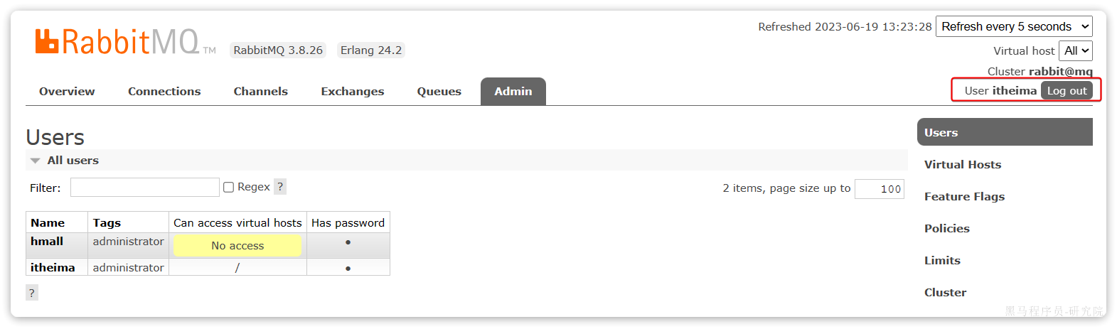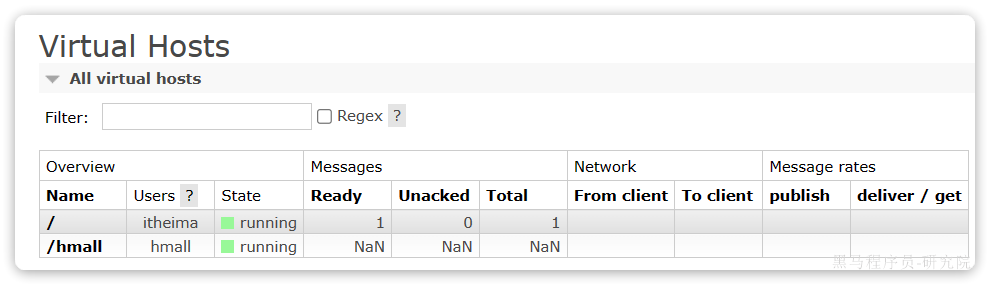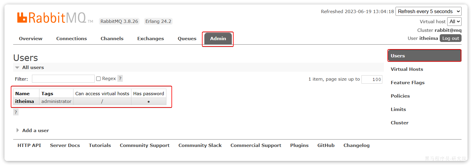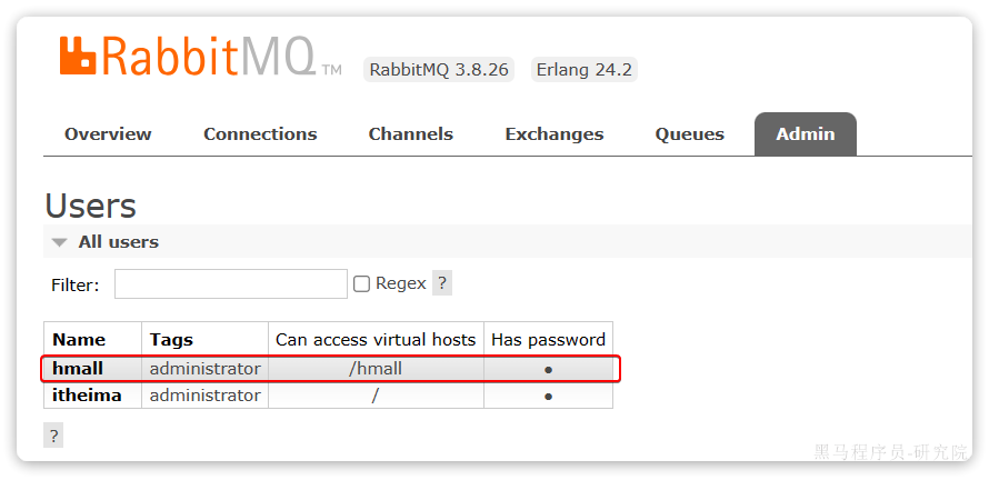 這里的用戶都是RabbitMQ的管理或運(yùn)維人員。目前只有安裝RabbitMQ時添加的itheima