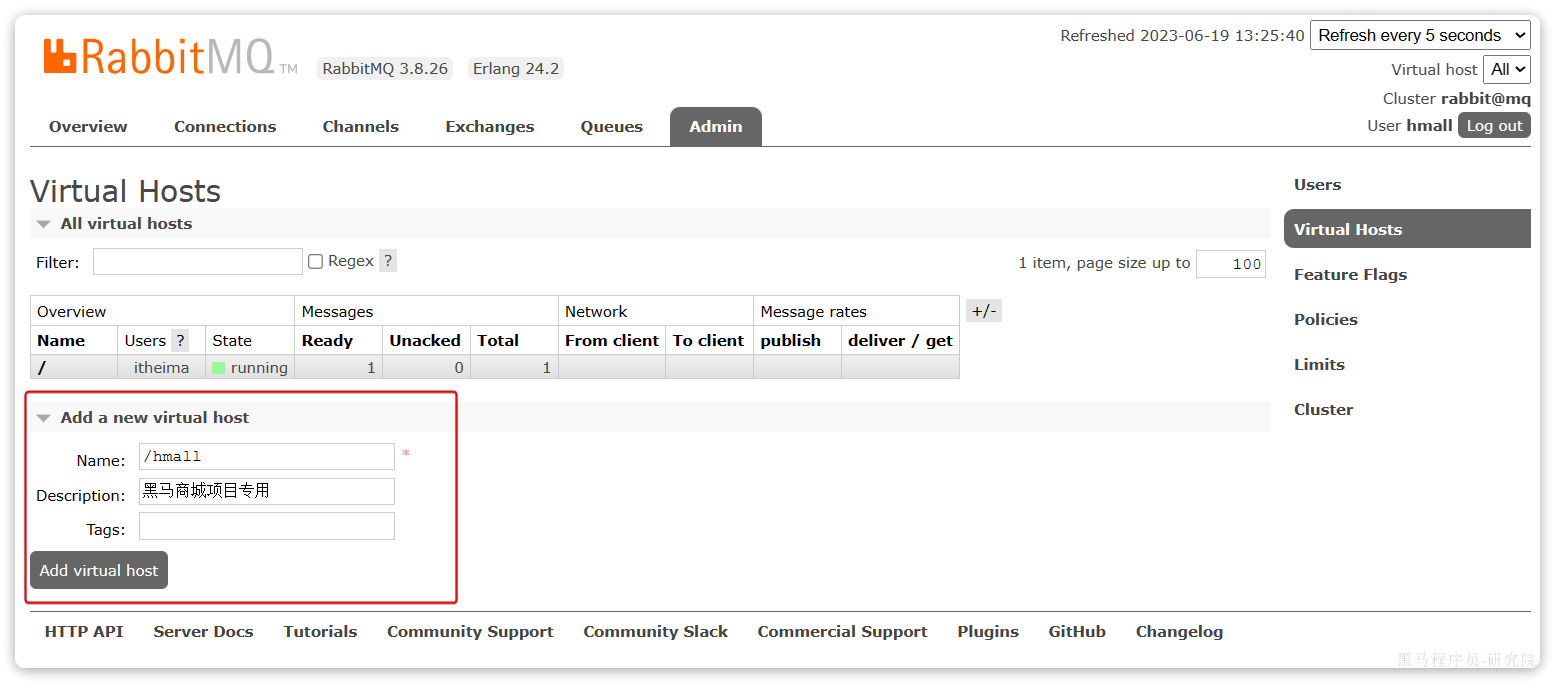 切換到剛剛創(chuàng)建的 用戶登錄,然后點(diǎn)擊Virtual Hosts