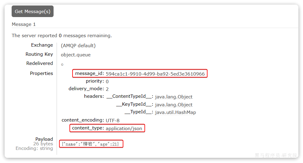 中的舊的消息。然后再次執(zhí)行剛才的消息發(fā)送的代碼,到MQ的控制臺查看消息結(jié)構(gòu):