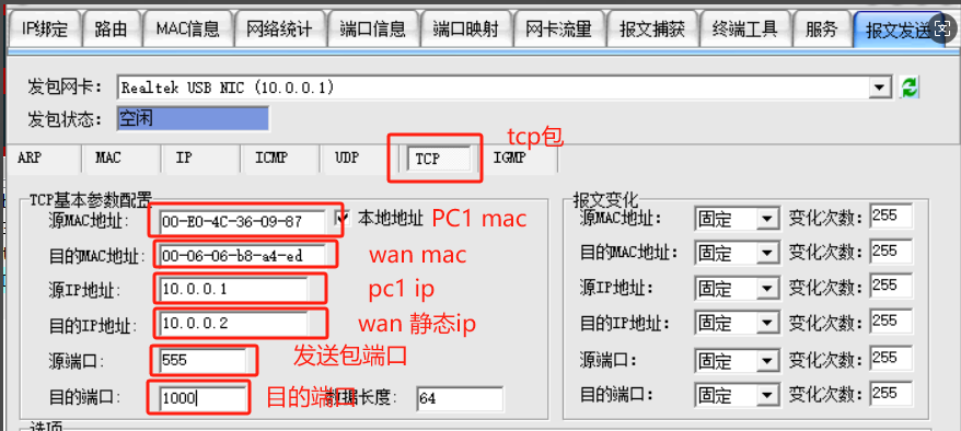 修改FORWARD規(guī)則:匹配原始端口1000(而非 333):iptables -A FORWARD -i eth0 -o br0 -p tcp --dport 1000 -d 192.168.10.2 -j ACCEPT - PC1發(fā)送包配置: