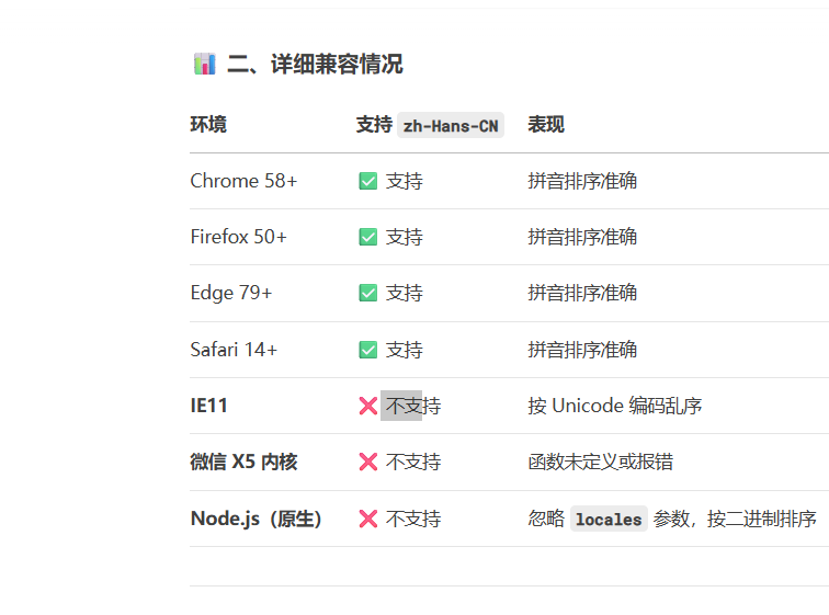 如:localeCompare函數(shù)在X5內(nèi)核(android版的微信瀏覽器)的瀏覽器不兼容該函數(shù),請注意使用。