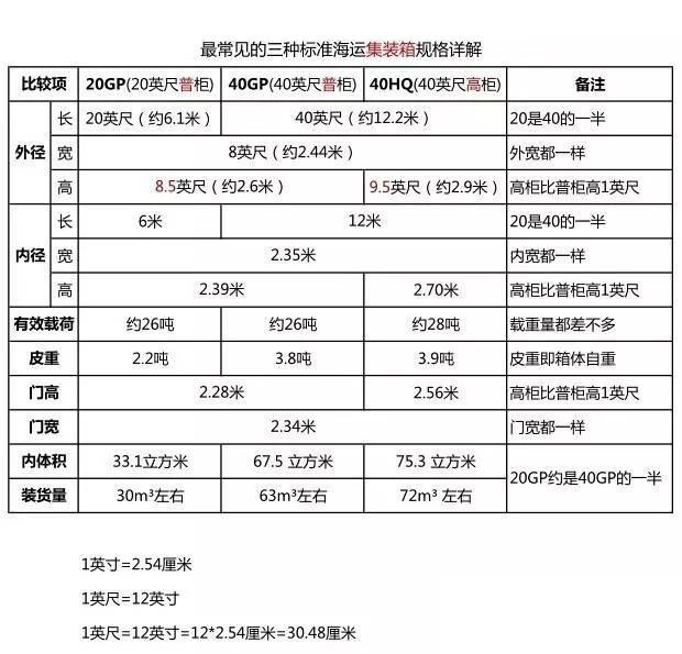 20GP、40GP和40HQ是三種最常用的集裝箱 ![]() 1)20GP的尺寸為:長(zhǎng)20英尺X寬8英尺X高8.5英尺,簡(jiǎn)稱20尺普柜(下圖) ![]() 2)40GP的尺寸為:長(zhǎng)40英尺X寬8英尺X高8.5英尺,簡(jiǎn)稱40尺普柜(下圖) ![]() 3)40HQ的尺寸為:長(zhǎng)40英尺X寬8英尺X高9.5英尺,簡(jiǎn)稱40尺高柜(下圖) ![]() 長(zhǎng)度單位換算方法: 1英寸=2.54cm 集裝箱的長(zhǎng)寬高計(jì)算: 1)寬度: 8英尺=8*30.48cm=2.438米 集裝箱的箱體體積(CBM)計(jì)算: 1)20GP的體積=長(zhǎng)*寬*高=6.096*2.438*2.59米≈38.5CBM,實(shí)際可裝貨物約30m? 45HQ的尺寸和體積又是多少? ![]() 長(zhǎng)=45英尺=45*30.48cm=13.716米 45HQ的箱體體積=長(zhǎng)*寬*高=13.716*2.438*2.89≈96CBM,實(shí)際可裝貨物約85m? 8種常見(jiàn)的集裝箱及代碼(20尺為例) 1)干貨箱:箱型代碼GP;95碼22G1 20尺、40尺、45尺明細(xì)如下: ![]() 仔細(xì)觀察一下,發(fā)現(xiàn)“規(guī)律”了嗎? 1)箱型代碼第一個(gè)字母為“G”的,都是普通集裝箱(普通箱和掛衣箱、冷凍箱、框架箱等特種箱相對(duì)),因?yàn)镚就是General,表示普通的、一般的、通用的 2)箱型代碼第二個(gè)字母為“H”的,都高箱,因?yàn)镠就是High,表示高的 3)95碼第一位數(shù)字為2的是20英尺,開(kāi)頭為4的是40英尺,開(kāi)頭為L(zhǎng)的是45英尺 4)95碼第二位數(shù)字為2的非高箱(8.5英尺高);為5的為高箱(9.5英尺高)——這個(gè)要特別注意,5并不代表45英尺,如40HQ的95代碼為45G1,這個(gè)極易讓人誤以為是45HQ的柜子,其實(shí)45G1指的是40HQ ![]() 對(duì)了,95碼是啥意思? 95碼就是聯(lián)合國(guó)UN/ISO標(biāo)準(zhǔn)代碼庫(kù)里面所提供的95版本的數(shù)字-字符型代碼 該文章在 2025/8/9 14:45:19 編輯過(guò) |