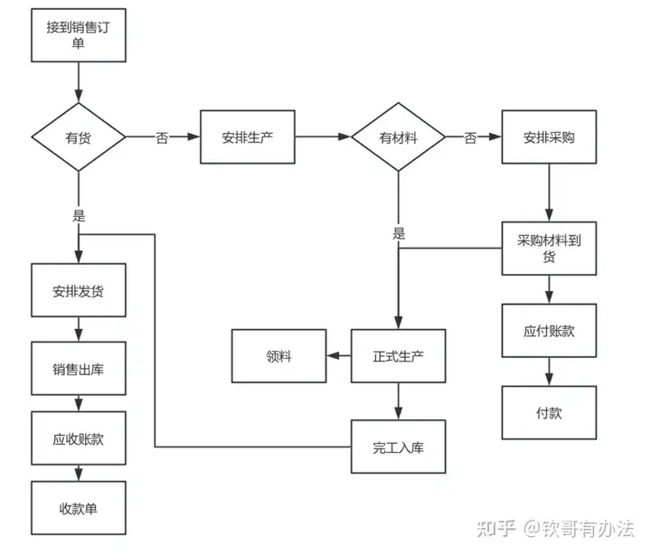 這就是大部分生產(chǎn)貿(mào)易型企業(yè)的業(yè)務(wù),當(dāng)然了,反向的流程我沒說,但是就是反過來而已。比如產(chǎn)品退貨、采購?fù)素洝⑸a(chǎn)退料等等。