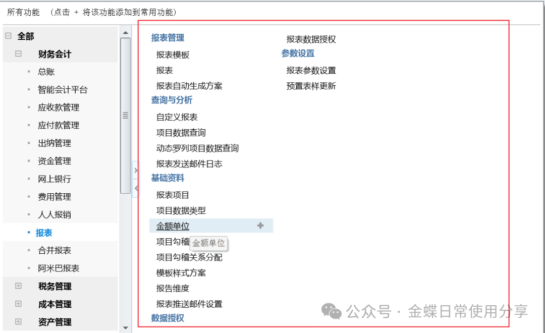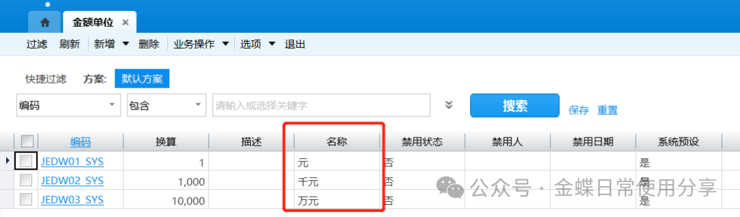3.3金額單位【業(yè)務(wù)場景】:由于報告對象的不同,同一個報表,可能需要出具不同金額單位的報表,如:資產(chǎn)負(fù)債表金額單位為“元”,同時還要出具資產(chǎn)負(fù)債“萬元”報表。 【用戶角色】:財務(wù)經(jīng)理 【功能菜單】:【財務(wù)會計】->【報表】->【基礎(chǔ)資料】->【金額單位】 【操作說明】:系統(tǒng)預(yù)置了三種金額單位:元、千元、萬元。