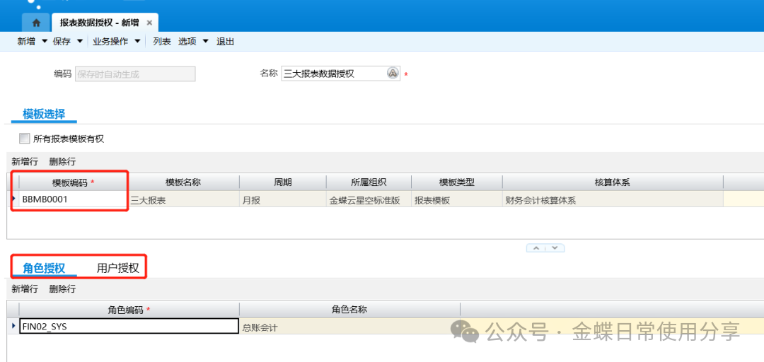 2.2數(shù)據(jù)授權(quán)【業(yè)務(wù)場景】:通過新增數(shù)據(jù)授權(quán)方案,賦予角色編輯報表模板的權(quán)限,從而間接控制到擁有哪些報表的數(shù)據(jù)權(quán)限。報表數(shù)據(jù)權(quán)限需要配合報表功能權(quán)限一起使用。如:有報表新增權(quán)限,但不具備A報表模板的權(quán)限,則該用戶在新增報表時選擇不到A報表模板。 【用戶角色】:財務(wù)經(jīng)理 【功能菜單】:產(chǎn)品路徑:【財務(wù)會計】->【報表】->【數(shù)據(jù)授權(quán)】->【報表數(shù)據(jù)授權(quán)】 【操作說明】:點擊【新增】按鈕,選擇需授權(quán)的報表模板、角色或者用戶,設(shè)置完成后保存數(shù)據(jù)授權(quán)方案;