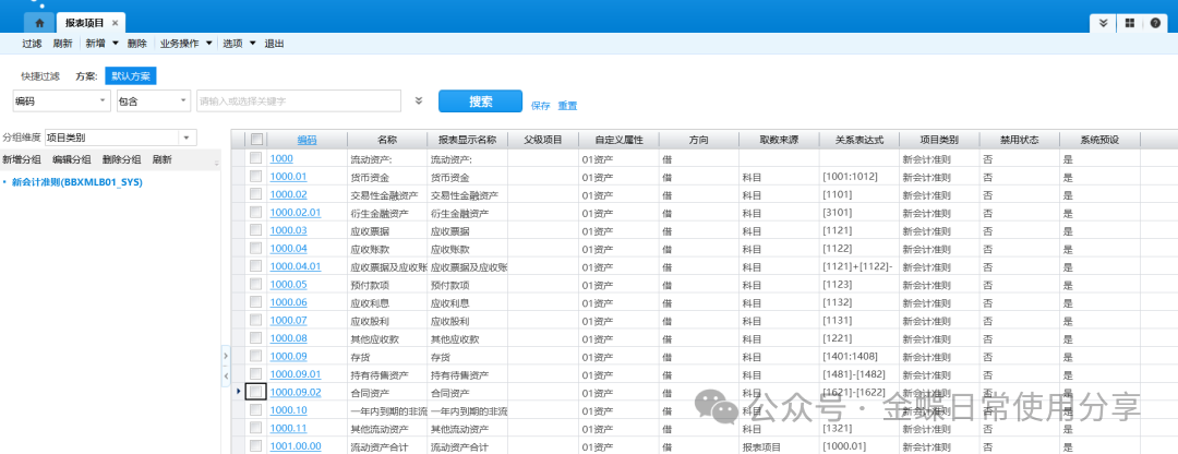 3報表編制準(zhǔn)備3.1報表項目【業(yè)務(wù)場景】:報表項目是報表系統(tǒng)的基礎(chǔ),報表項目的設(shè)置完全依據(jù)企業(yè)管理與分析的需要而設(shè)置,企業(yè)需要什么樣的報表,就可以將報表上的所有項目指標(biāo)對應(yīng)設(shè)置為報表項目。 【用戶角色】:財務(wù)經(jīng)理 【功能菜單】:【財務(wù)會計】->【報表】->【基礎(chǔ)資料】->【報表項目】 【操作說明】:系統(tǒng)預(yù)設(shè)了新會計準(zhǔn)則的報表項目,用戶可根據(jù)需要進(jìn)行修改和新增。