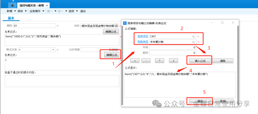 1.編輯左右表達(dá)式:在編輯公式對話框中選擇報表項目、取數(shù)類型、年度及期間,選擇完畢后點擊【填入公式】,核算公式無誤后點擊【確定】;