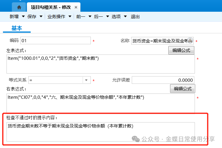 2.在“檢查不通過時的提示內(nèi)容”文本框中維護(hù)相應(yīng)信息,作為報表項目數(shù)據(jù)檢查不滿足勾稽關(guān)系時提示的內(nèi)容;