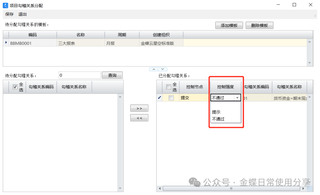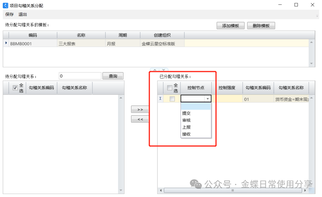 3.5項目勾稽關(guān)系分配【業(yè)務(wù)場景】:報表項目勾稽關(guān)系定義完成后,需要將勾稽關(guān)系分配給需要進(jìn)行相應(yīng)檢查的報表。 【用戶角色】:財務(wù)經(jīng)理 產(chǎn)品路徑:【財務(wù)會計】->【報表】->【基礎(chǔ)資料】->【項目勾稽關(guān)系分配】 【操作說明】:新建項目勾稽關(guān)系分配:添加報表模板,將待分配勾稽關(guān)系選擇分配到“已分配勾稽關(guān)系”中;