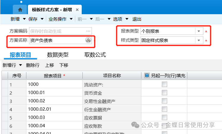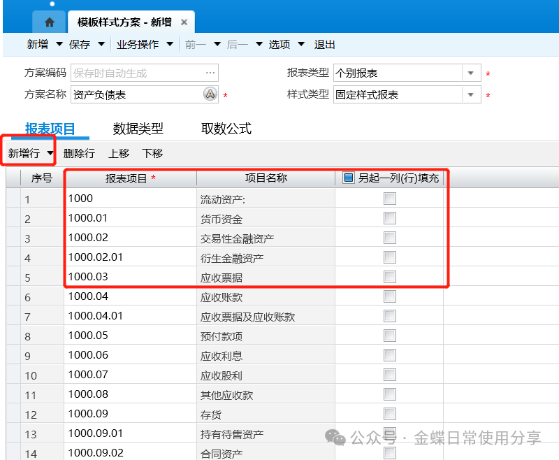 1.報表項目:通過“新增行”操作選擇報表中需要列示的報表項目,并選擇是否需要“另起一列(行)填充”;