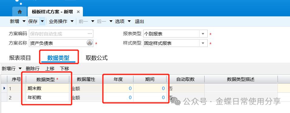 2.數(shù)據(jù)類型:選擇報表項目的數(shù)據(jù)類型,并維護(hù)年度和期間(建議保持默認(rèn)值0,當(dāng)年度、期間=0時,指的是報表的本年本期);