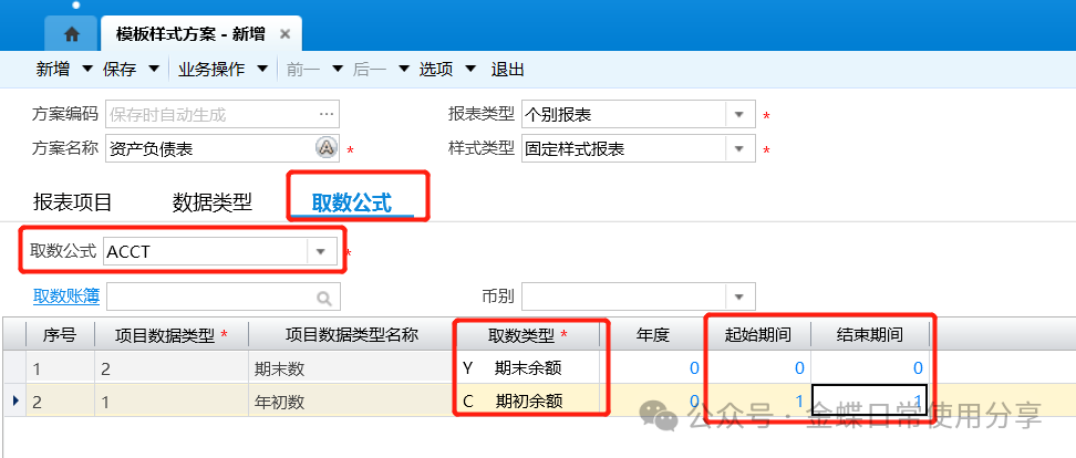 3.取數(shù)公式:選擇模板樣式方案的取數(shù)公式,并選擇每個項目數(shù)據(jù)的取數(shù)類型(期末數(shù)一般取期末余額,年初數(shù)一般取期初余額),維護(hù)起始期間和結(jié)束期間;
