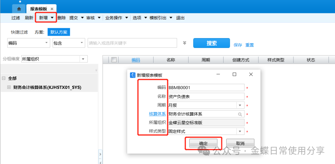 4報表編制4.1報表模板【業(yè)務(wù)場景】:企業(yè)用于管理和分析的很多報表其格式在一段期間里一般不會發(fā)生變化,這就適合制作成模板樣式,方便重用。報表模板新建后還只是一張空的模板,還需要編輯報表模板中的報表格式,設(shè)置單元格的項目公式、取數(shù)公式等。 【用戶角色】:財務(wù)經(jīng)理 【功能菜單】:【財務(wù)會計】->【報表】->【報表管理】->【報表模板】 【操作說明】:點擊【新增】按鈕,彈出【新增報表模板】框,輸入報表名稱,選擇對應(yīng)的周期、核算體系、所屬組織、樣式類型,點擊【確定】按鈕;