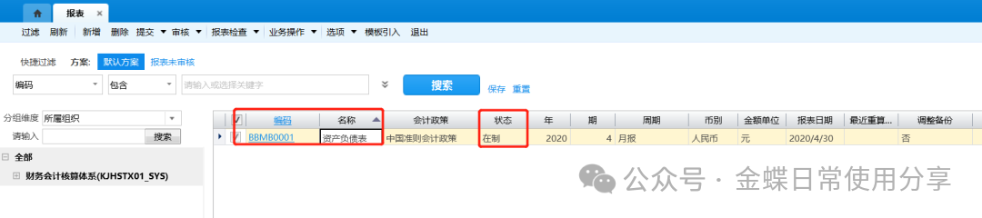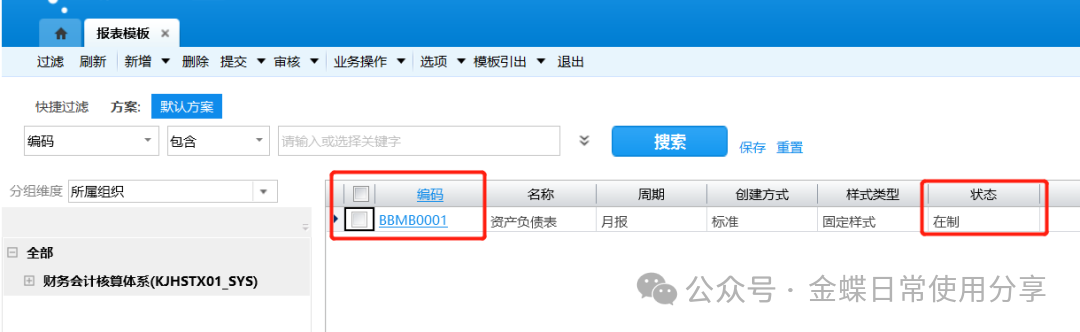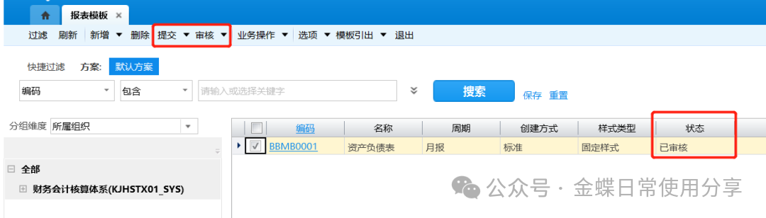 4.修改完成后保存報表模板,并將報表模板【提交】、【審核】,審核后報表模板的狀態(tài)從“在制”變?yōu)椤耙褜徍恕保?/span>