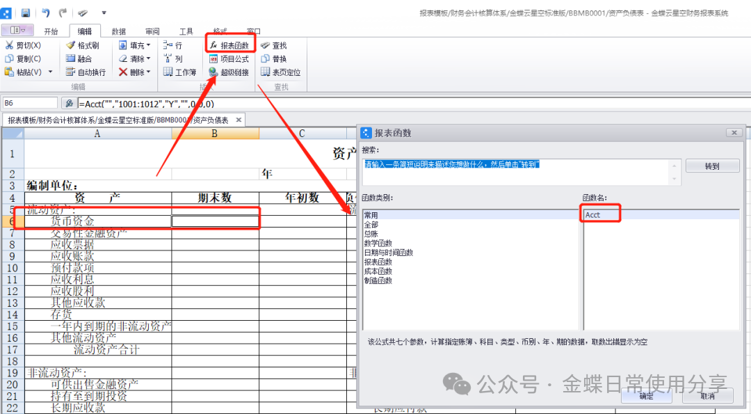 3.根據(jù)實際業(yè)務(wù)和報表取數(shù),可編輯取數(shù)來源或者取數(shù)公式; (1)選中需要編輯取數(shù)來源或者取數(shù)公式的單元格,點擊【編輯】下的【報表函數(shù)】,選擇具體函數(shù)(如Acct),點擊【確定】;