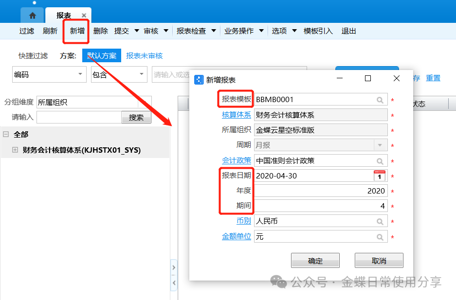 4.2報表編制【業(yè)務(wù)場景】:用于管理和分析的報表都需要有完整的數(shù)據(jù)。根據(jù)模板建好的報表是沒有數(shù)據(jù)的,因此需要完成報表的取數(shù)過程。 【用戶角色】:財務(wù)經(jīng)理 【功能菜單】:【財務(wù)會計】->【報表】->【報表管理】->【報表】 【操作說明】:點擊【新增】按鈕,彈出【新增報表】框,選擇對應(yīng)的報表模板,報表日期、年度、期間,點擊【確定】按鈕;