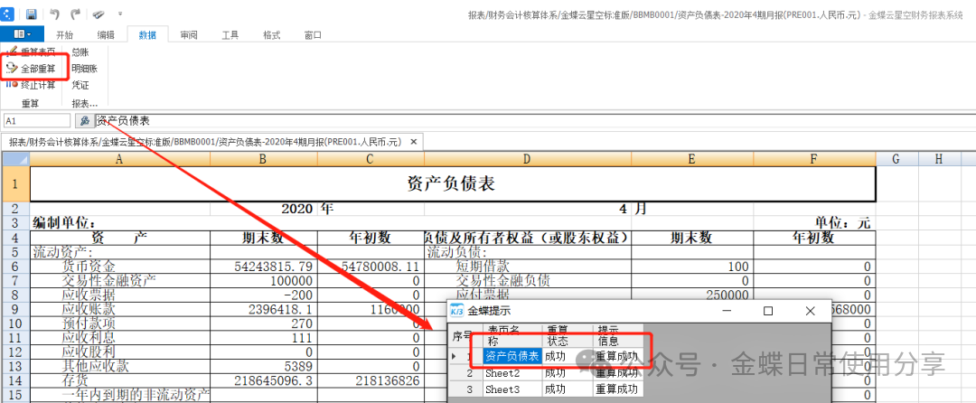 2.點擊【數(shù)據(jù)】下的【全部重算】按鈕,系統(tǒng)會自動重新計算所有表頁。若點擊【重算表頁】按鈕,則系統(tǒng)只會自動重新計算當(dāng)前表頁。系統(tǒng)會根據(jù)定義好的取數(shù)公式以及公式參數(shù)進(jìn)行取數(shù)。系統(tǒng)會提示是否重算成功;
